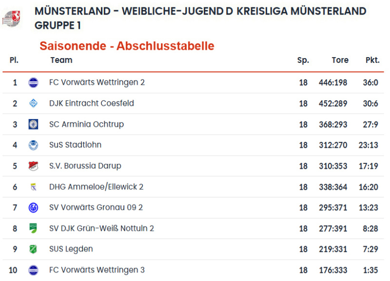 Die D-Juniorinnen der SuS-Handballabteilung haben eine Saison mit Höhen und Tiefen hinter sich. Mit 3 Siegen und 1 Unentschieden beenden sie die Saison auf dem 9. Tabellenplatz.