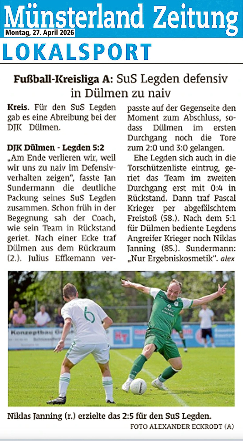 Ein wahres Debakel erlebte Kreisligist SuS Legden I bei der 2:5 (0:3)-Schlappe in Dülmen - dagegen lief die "Torfrabrik" beim SuS III und dem 14:2 (5:1)-Heimsieg gegen SG Gronau II auf Hochtouren.