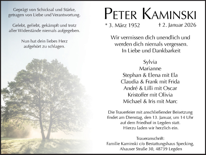Peter Kaminski starb am 2. Januar im Alter von 73 Jahren - er wird am 13. Januar in Legden beigesetzt.