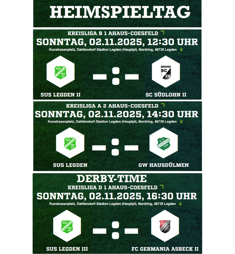 Im Dahliendorfstadion herrscht damit am Sonntag einmal mehr Hochbetrieb im Zwei-Stunden-Rhythmus: Um 12.30 Uhr trifft B-Ligist SuS II auf den SC Südlohn II, um 14.30 Uhr Kreisliga-Tabellenführer SuS I auf GW Hausdülmen und um 16.30 Uhr. Bereits um 10.45 Uhr messen sich an gleicher Stelle die B I-Juniorenfußballer der JSG Legden/Asbeck mit der JSG Eintr./TSV Ahaus.