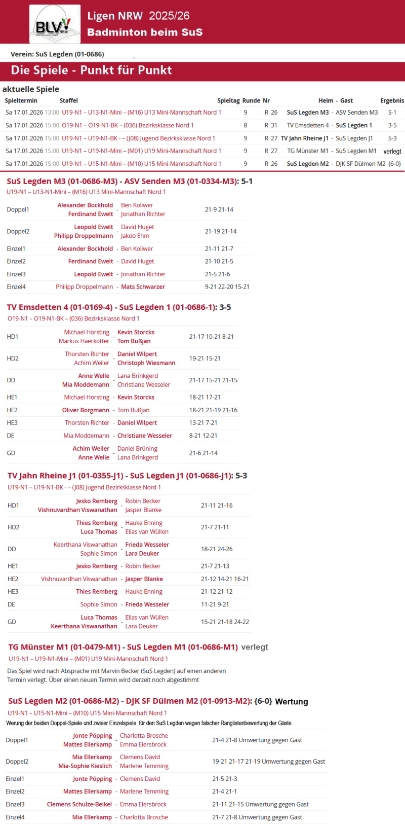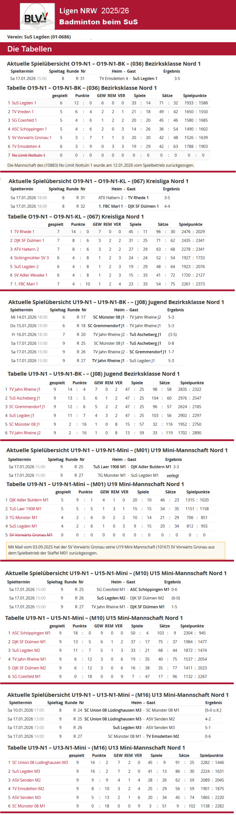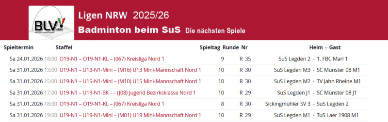 Die Ergebnisse vom Wochenende, die Tabellen, die Infos zu den Spielen der SuS-Teams und die nächsten Spiele