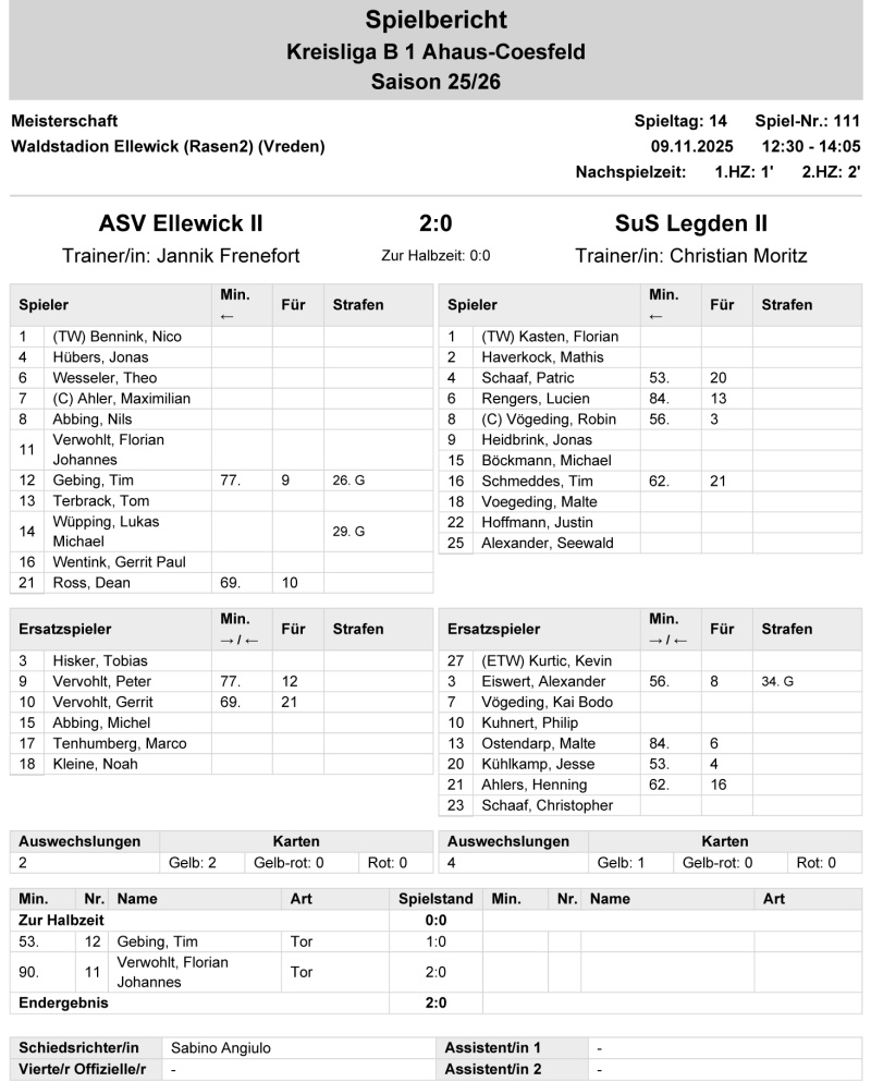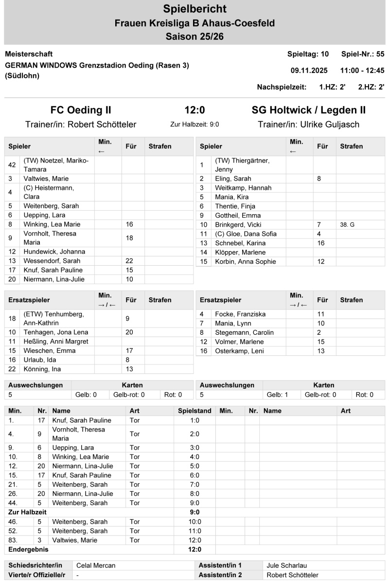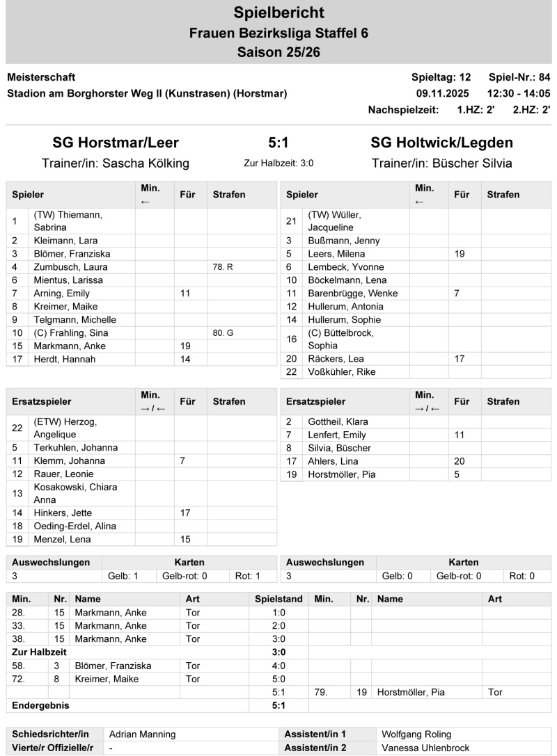 Dagegen kassierten SuS Legden II (0:2 beim B-Liga-Schlusslicht ASV Ellewick II) und die beiden Frauenteams der SG Holtwick/Legden bei den Spitzenreitern ihrer Spielklassen derbe Niederlagen: SG I bei SG Horstmar/Leer 1:5 und SG II beim FC Oeding II 0:12.