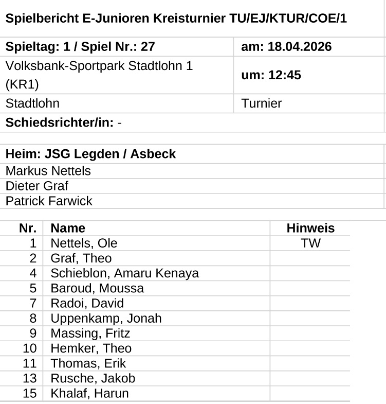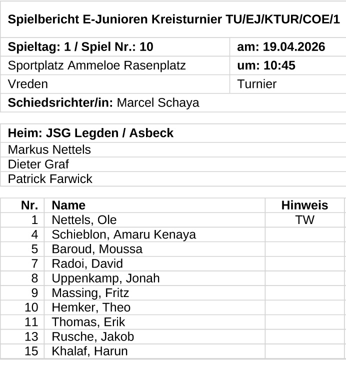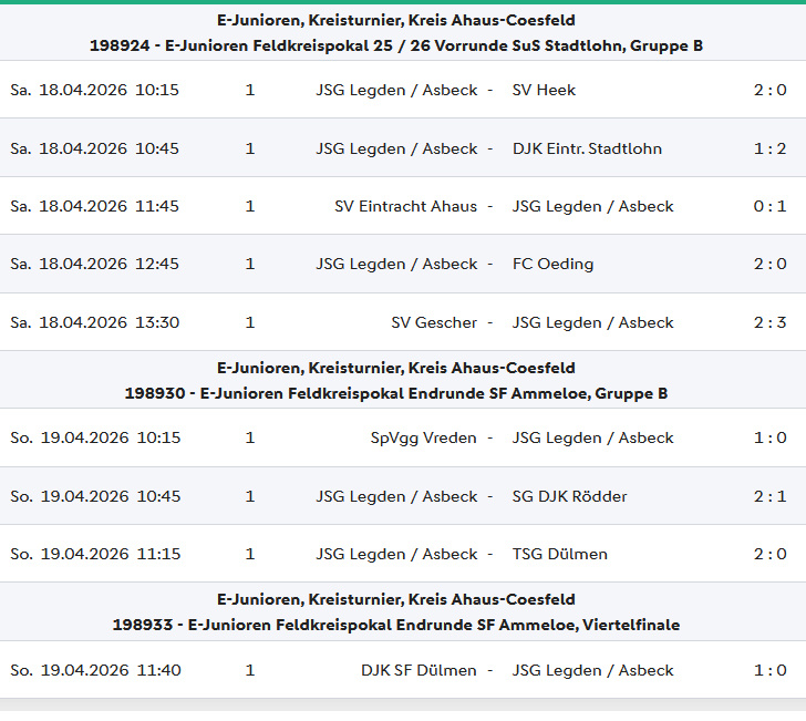 In den Vorrundenspielen beim SuS Stadtlohn sicherte sich das JSG-Team nach fünf Spielen am Samstag die Spitze der Vorrundengruppe und buchte das Ticket für das Endrundenturnier einen Tag später bei den SF Ammeloe. Dort qualizierten sich die Kicker aus Legden und Asbeck mit einem zweiten Rang in der Endrunden-Gruppenphase für das Viertelfinale - 16 Mannschaften waren in Ammeloe am Start.