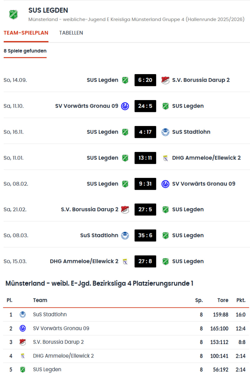 Zur Rückrunde wurde die Liga neu eingeteilt, sodass die Mannschaften der Kreisliga-Plätze 2-5 in der Platzierungsrunde aufeinandertrafen. Gegen drei dieser Gegner hatte die SuS-Mannschaft in der Hinrunde verloren. Leider mussten sich die Mädchen in vier Spielen geschlagen geben.