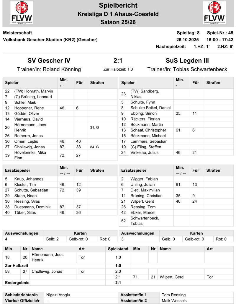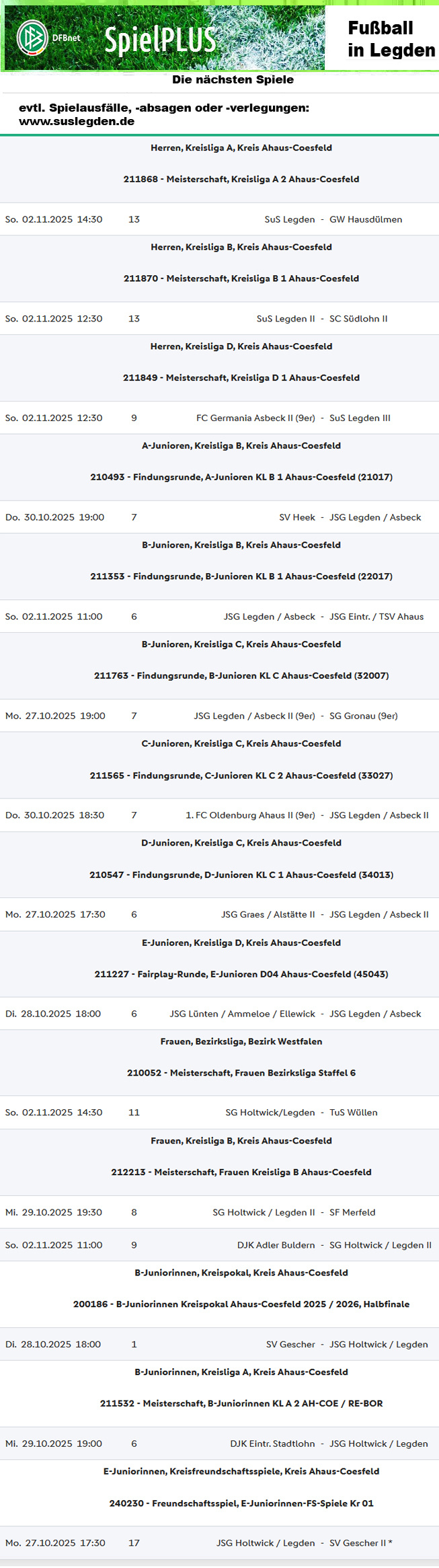 Das regnerisch, stürmische Wetter am Sonntag hat das Gastspiel des SuS Legden II bei der TG Almsick verhindert - SuS III kassierte in Gescher eine 1:2-Niederlage.