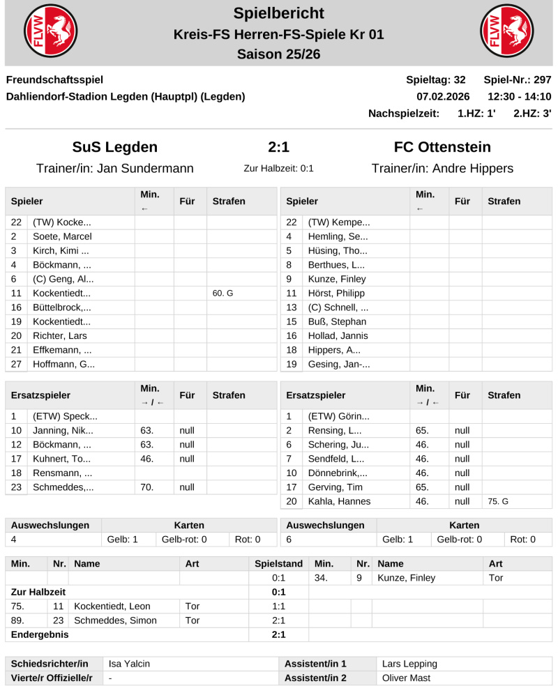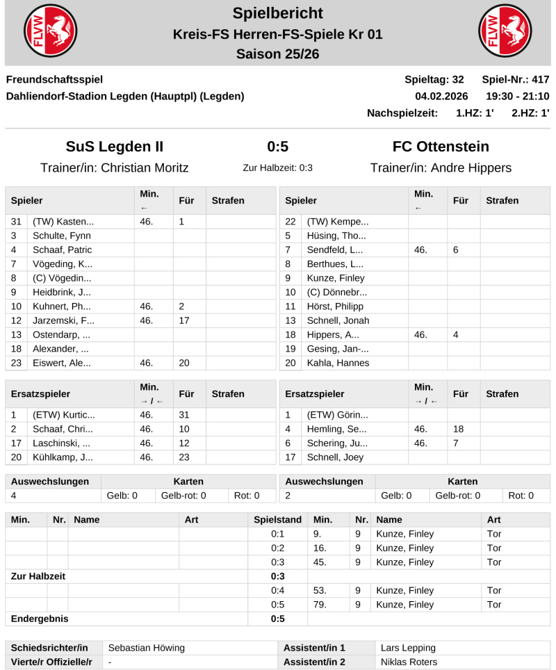 Alle fünf Treffer beim 5:0 (3:0)-Sieg des A-Ligisten aus der Staffel 1 steuerte Kunze am Mittwoch im Testspiel gegen den B-Ligisten SuS Legden II bei - drei Tage später markierte er an gleicher Stelle den Führungstreffer für den FC Ottenstein im Vergleich mit dem SuS Legden I. Während der SuS II keine Antwort auf die Tore des FC-Angreifers fand, wussten Leon Kockentiedt und "Joker" Simon Schmeddes am Samstag auf den Rückstand zu reagieren und trafen zum 2:1 (0:1)-Sieg. Zeitgleich kassierte der SuS II im Freundschaftsspiel bei SW Holtwick II eine erneute Niederlage - die file aber nach dem Anschlusstreffer von Jonas Heidbrink mit 1:2 (0:1) sehr knapp aus.