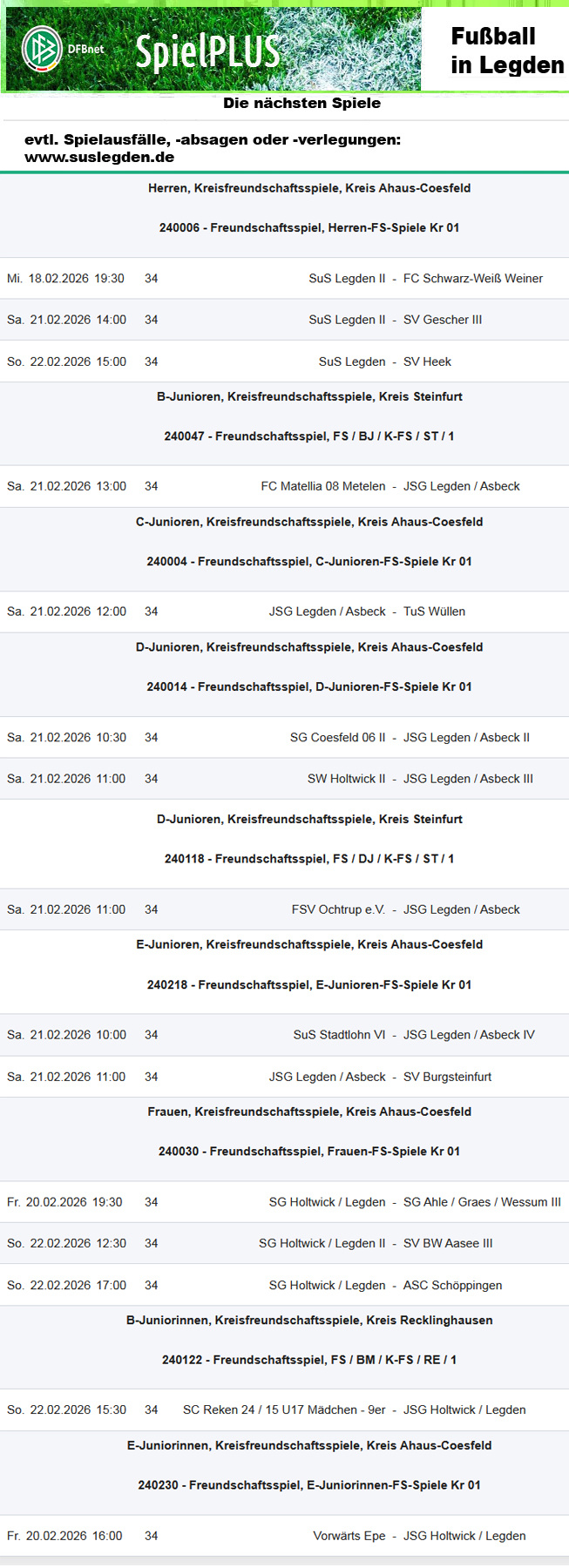 B-Ligist SuS Legden II nimmt nun in dieser Woche noch zwei Anläufe, um in der Vorbereitungszeit auf die Rest-Spielzeit einen Erfolg zu buchen - am 1. März geht es schließlich wieder um Meisterschaftspunkte. Und das im DERBY gegen den FC Germania Asbeck.