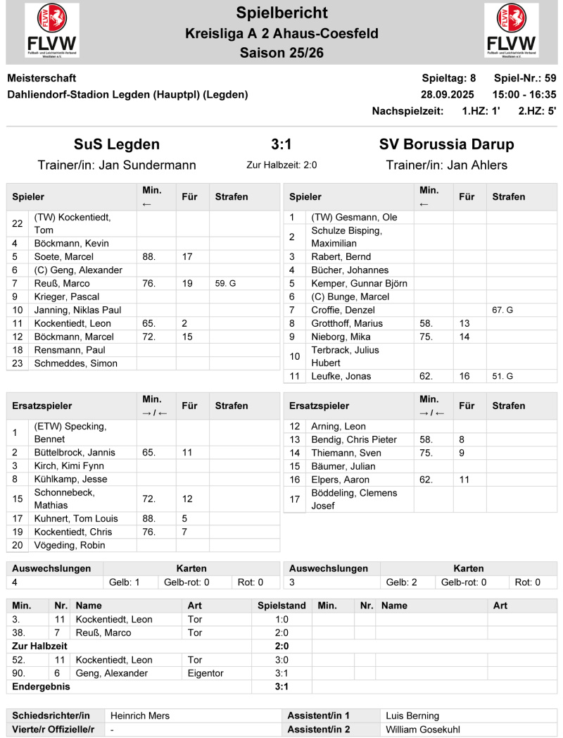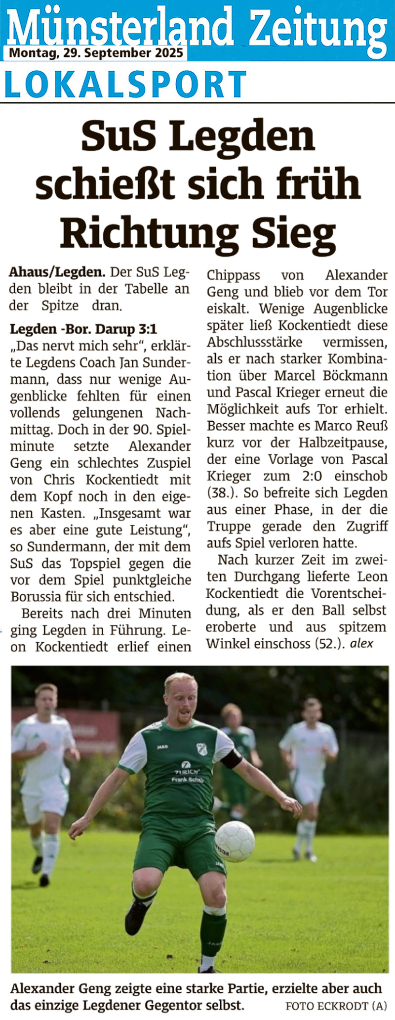 Die Kreisliga-Fußballer des SuS Legden I haben auch im Top-Spiel der Kreisliga A2 ihre Heimstärke eindrucksvoll unter Beweis gestellt: Im Heimspiel gegen den punktgleichen Tabellen-Zweiten, Borussia Darup, gelang dem Dritten der Liga ein glatter 3:1-Sieg.