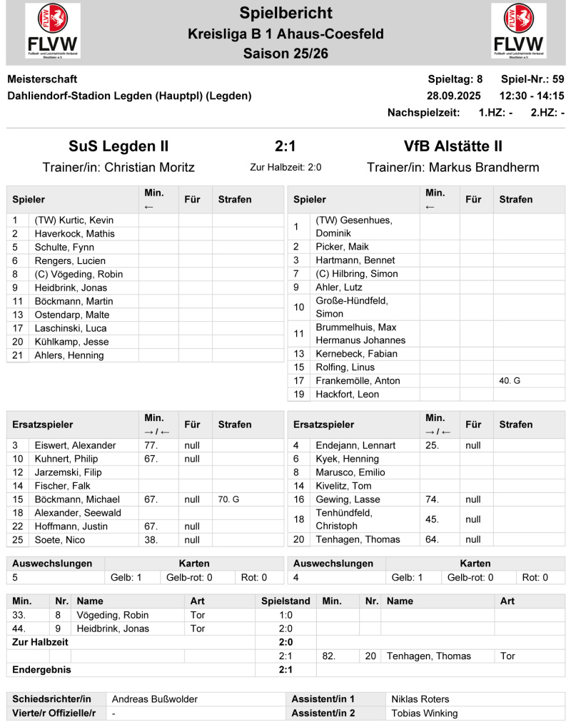 Im "Keller-Derby" der Kreisliga B1 ist dem SuS Legden II "endlich" Saisonsieg Nr. 2 gelungen: Im Heimspiel gegen VfB Alstätte II glückte ein 2:1-Sieg und der Sprung Tabellen-Platz 13. Das nächste Spiel ist verlegt worden: Beim ASC Schöppigen II stellt sich der SuS II erst am Mittwoch, 8. Oktober, vor.