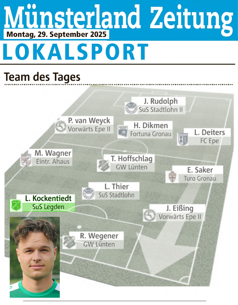 Mit seinen zwei Treffern im Spitzenspiel gegen Bor. Darup wurde Leon Kockentiedt von der MLZ in das "Team des Tages" berufen - mit fünf Saisontoren kletterte Kockentiedt in der A-Liga-Torjägerliste auf Rang 5.