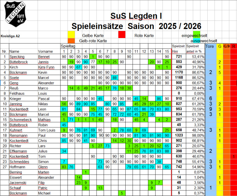 Ingesamt zwölf Kicker des SuS I haben sich in den 15 Spielen in der Torschützenliste verewigt: Leon Kockentiedt führt mit neun Saisontreffern die interne Tojägerliste an und belegt in der Liga-Wertung derzeit einen dritten Rang. Pascal Krieger (6 Tore), Alexander Geng, Marco Reuß, Niklas Janning, Marcel Böckmann, Tom Louis Kuhnert, Simon Schmeddes, Glenn Hoffmann (je 3), Kevin Böckmann, Julius Effkemann (je 2) und Patric Schaaf (1) sorgten zudem für die drittbeste Torausbeute der Liga.