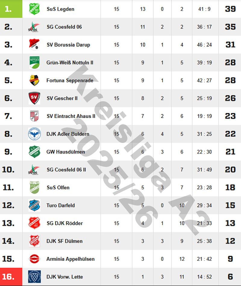 Halbzeit in der Fußball-Kreisliga-Saison 2025/26: SuS Legden hat sich nach 15 Spieltagen ein Polster von vier Punkten zugelegt. Daneben gibt es eine Vielzahl von Zahlen und Fakten, die für den Herbstmeister sprechen - eine Bilanz.