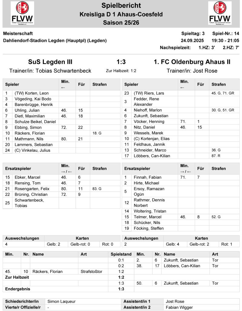 Am Ende der Nachholpartie am Donnerstag beim SuS Legden III standen die Gäste vom FC Oldenburg II nur noch mit acht Spielern auf dem Platz und ohne Trainer an der Seitenlinie - aber mit dem 3:1 (2:1)-Sieg mit drei Punkten da.
