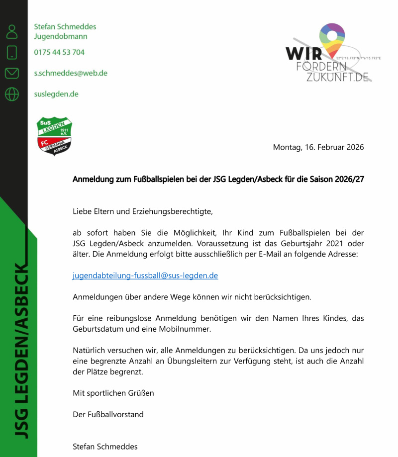 Die Jugendspielgemeinschaft (JSG) SuS Legden/FC Germania Asbeck wendet sich mit einem "0ffenen Brief" an die Eltern/Erziehungsberechtigten von Fußball-interessierten Kindern:
