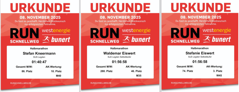 In Mülheim gestartet, machten sich drei Langstreckler des SuS auf die Halbmarathon-Distanz mit Wendepunkt in Essen: Stefan Kneermann überquerte die Ziellinie nach 1:40:47 Stunden, gefolgt vom zeitgleichen Ehepaar Stefanie und Waldemar Eiswert (1:56:58 Stunden).