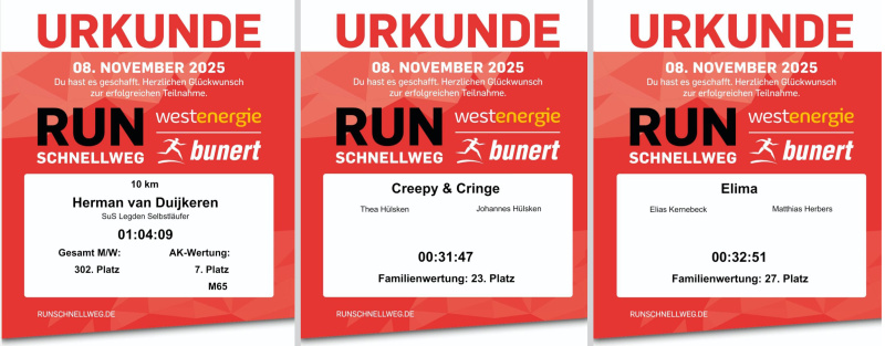 Herman van Duijkeren meisterte die Zehn-Kilometer-Strecke in 1:04:09 Stunden. In der Familienwertung des 5-km-Rennens wurden Johannes Hülsken mit Tochter Thea nach 31:47 Minuten gestoppt, Matthias Herbers und Enkel Elias Kernebeck benötigten 32:51 Minuten.