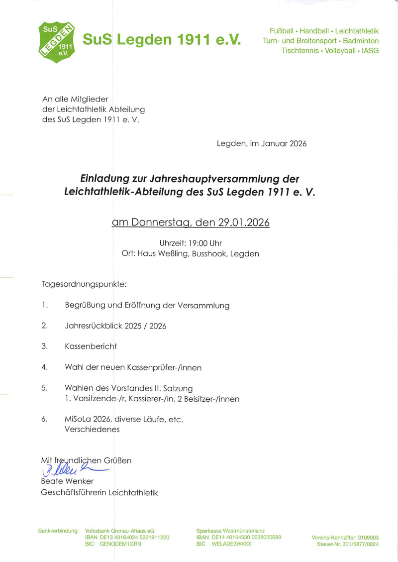 Die Leichtathletik-Abteilung des SuS Legden lädt ein zur Jahresversammlung am Donnerstag, 29. Januar, um 19 Uhr im Haus Weßling, Busshook.