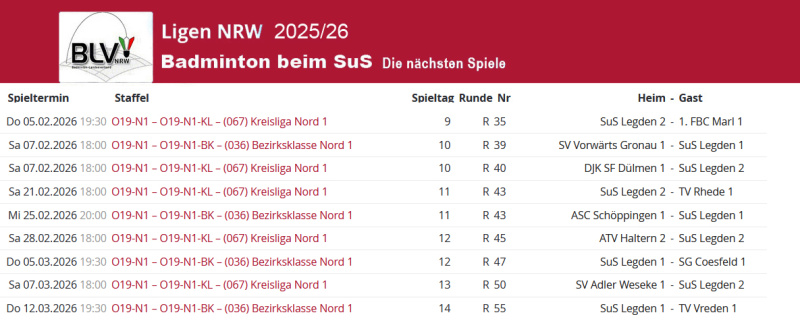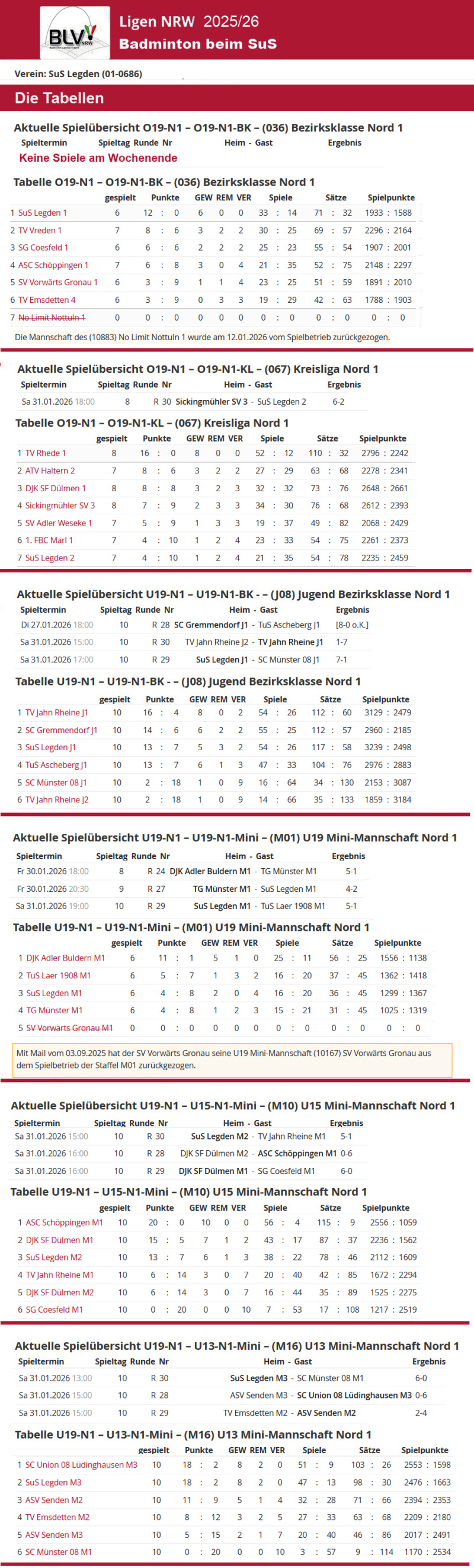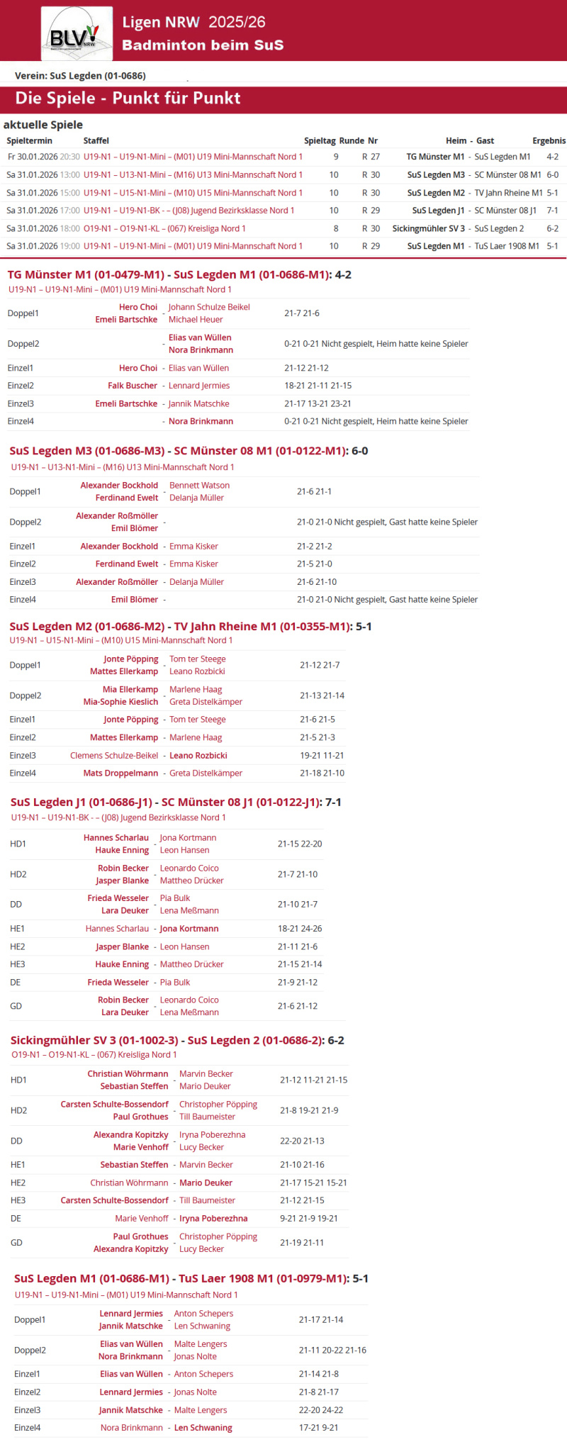 Die Ergebnisse, Infos zu den Spielen des SuS, die Tabellen und die nächsten Spiele
