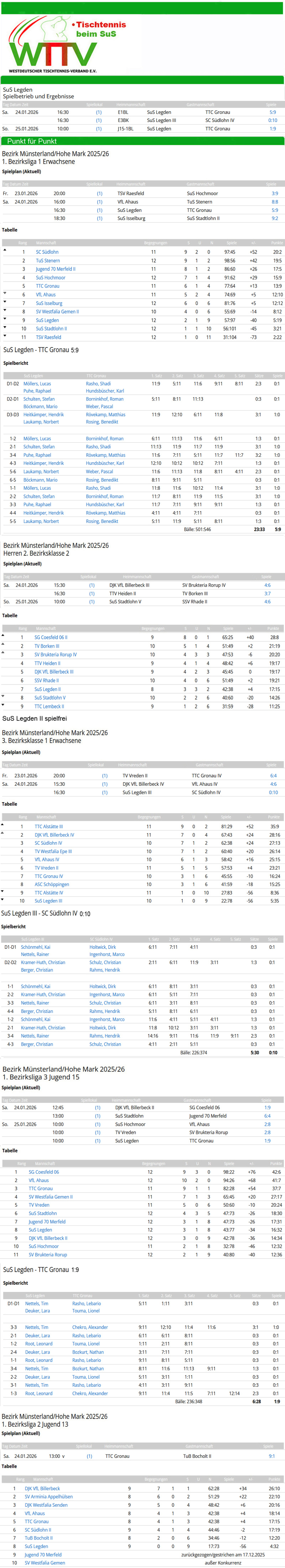Ihre jeweils neunte Saison-Niederlage haben zwei Tischtennis-Mannschaften des SuS Legden einstecken müssen: In ihren Heimspielen verlor der SuS I gegen TTC Gronau mit 5:9 und SuS III gegen SC Südlohn IV mit 0:10.