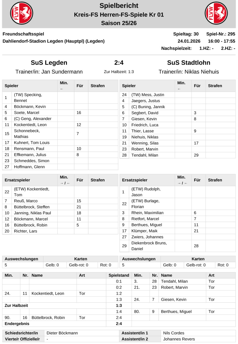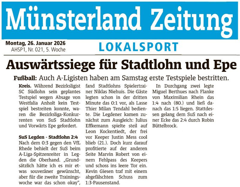 Die Stadtlohner um Niklas Niehuis, dem ehemaligen Trainer-Kollegen von Legdens Chefcoach Jan Sundermann, führten nach nur drei Minuten durch einen Distanzschuss von Milan Tendahl. Leon Kockentiedt sorgte für den 1:1-Ausgleich, ehe Marvin Robert und Kevin Giesen noch vor den Seitenwechsel auf 3:1 für die Gäste stellten. 4:1 hieß es nach 80 Minuten und dem Treffer von Maximilian Rhein - Robin Büttelbrock krönte sein Comeback nach langer Verletzungs-Zwangspause mit dem Treffer zum 2:4-Endstand. Der SuS-Kicker war seit seinem 45-Minuten-Einsatz im Saisoneröffnungsspiel nicht mehr für den SuS I am Ball gewesen.