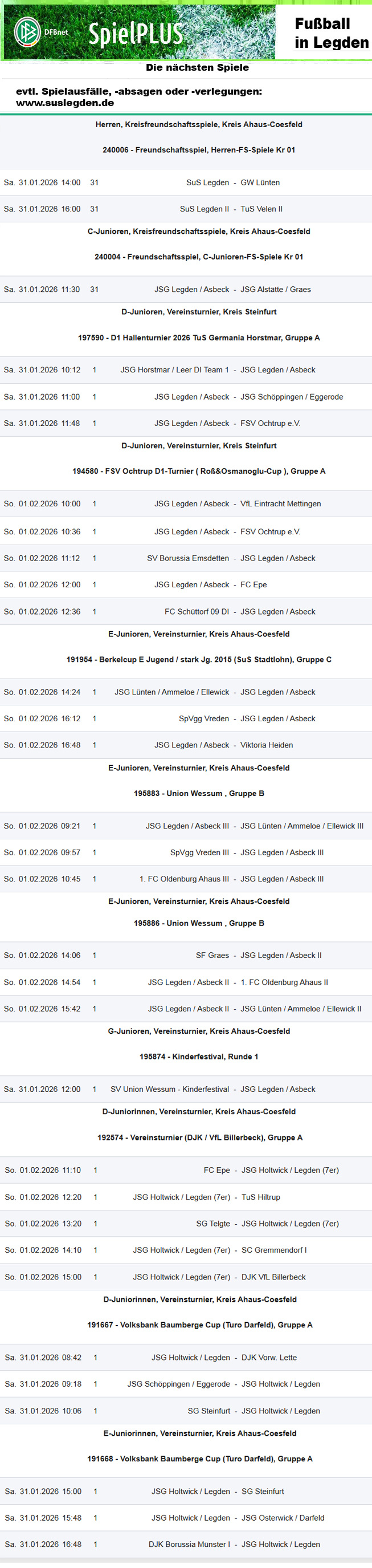 Die Infos zum Spiel des SuS I sowie der antsprechende Pressebericht, eine Ergebnis-Übersicht vom Wochenende und die nächsten Termine