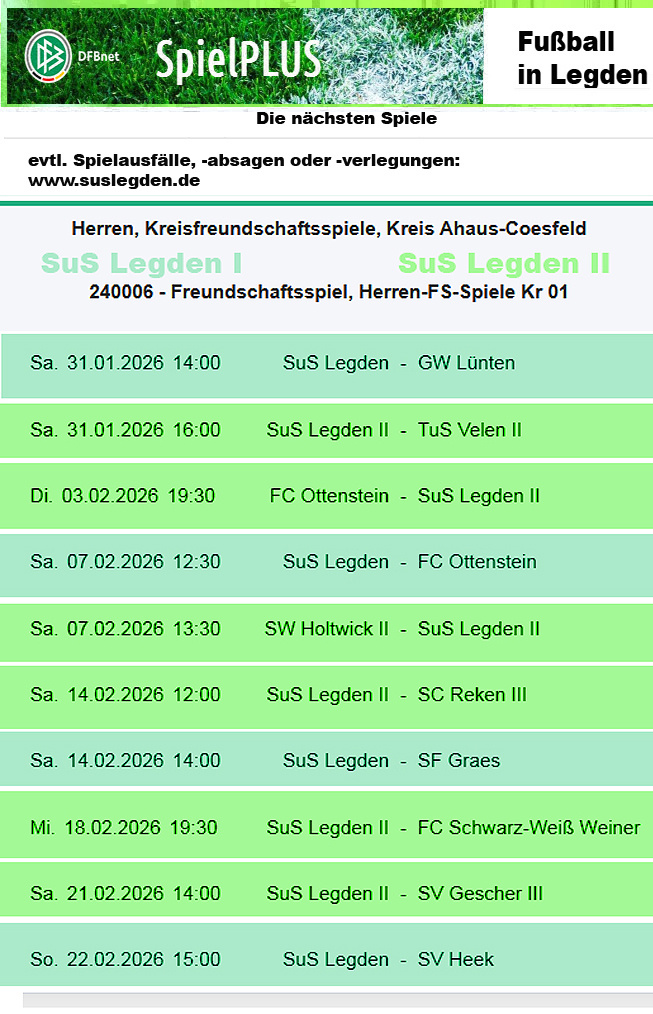 Am Samstag, 31. Januar, stellt sich GW Lünten zum Freudschafts- und Testspiel im Dahliendorfstadion vor - Anstoß ist um 14 Uhr. Zwei Stunden später trifft SuS Legden II an gleicher Stelle auf TuS Velen II.