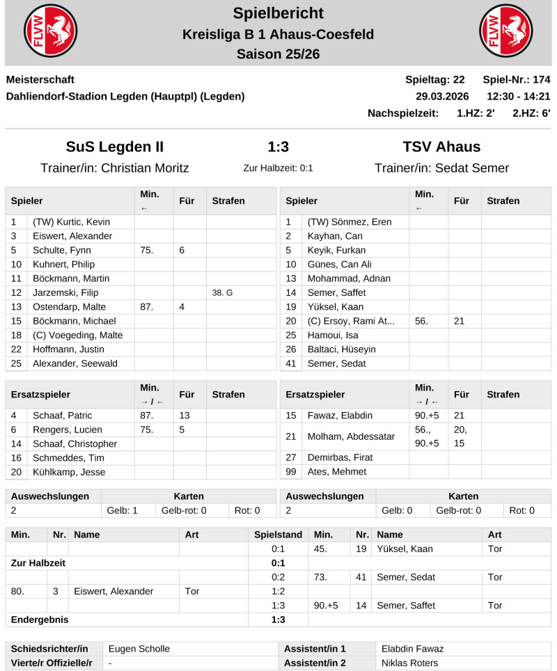 Mit einer enttäuschenden Vorstellung und einer 1:3 (0:1)-Niederlage gegen „Kellerkind“ TSV Ahaus hat sich das B-Liga-Team des SuS Legden II in die Osterpause verabschiedet. Dabei hatten die Ahauser ihre 2:0-Führung nach Treffern von Kaan Yüksel (45.) und dem neuen Spielertrainer Sedat Semer (73.) überlegen verwaltet - der 1:2-Anschlusstreffer von Alexander Eiswert hatte nach 80 Minuten einige Hoffnungen auf ein besseres Ende geschürt, doch Saffet Semer bugsierte das Leder in der Nachspielzeit zum 3:1-Endstand in die Maschen. Nach dem Gastspiel beim VfB Alstätte II (12. 4.) folgt das Heimspiel gegen ASC Schöppingen II am 19. April.