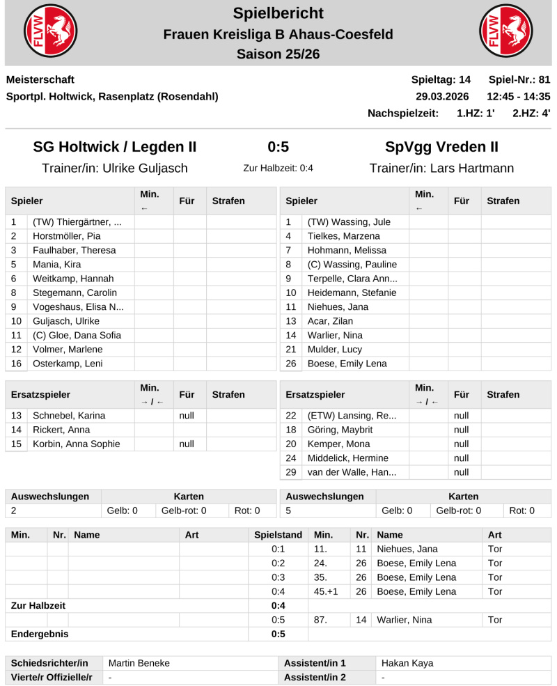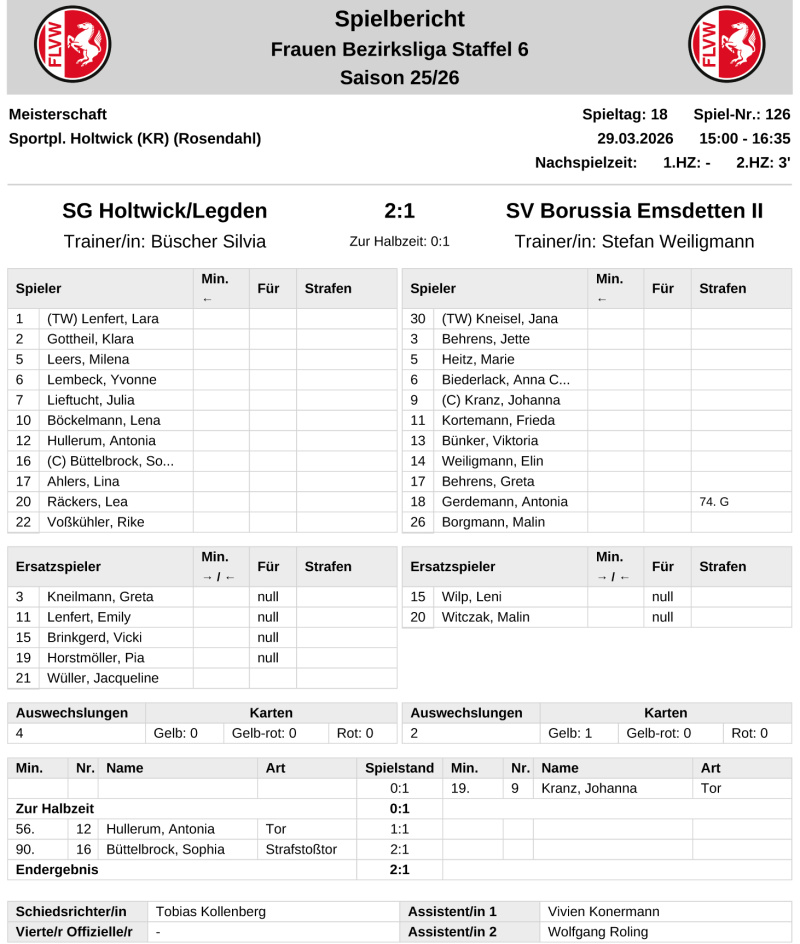 Den Bezirksliga-Fußballerinnen der SG Holtwick/Legden I glückte ein 2:1 (0:1)-Sieg im Heimspiel gegen Bor. Ensdetten II - das Kreisliga B-Team der SG II kassierte gegen SpVgg Vreden II eine 0:5 (0:4)-Heim-Niederlage.