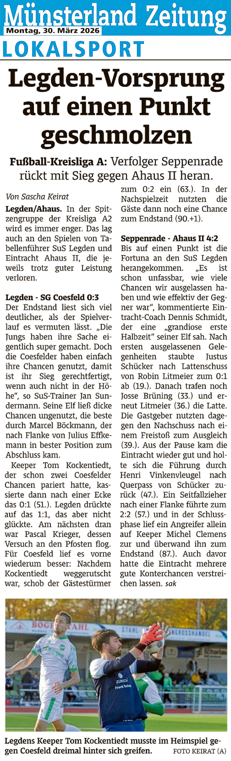 Dennoch blieben in dem ausgeglichenen und recht ansehnlichen Spiel die Torchancen zunächst aus - die leichten Feldvorteile buchten aber die Gäste für sich. Und so dauerte es bis zur 51. Minute, ehe im Dahliendorfstadion Torjubel zu vernehmen war: Die Gäste aus Coesfeld, zuletzt durch ein 4:0 im Verfolger-Derby gegen GW Nottuln II wieder in den Fokus des Meisterschaftsrennens gerückt, führten nach einer Ecke und viel "Gewusel" im SuS-Strafraum plötzlich mit 1:0. Zuvor hatte SuS-Keeper Tom Kockentiedt durch zwei spektakuläre Rettungstaten die SG-Führung verhindert. Dem 2:0 der Gäste ging ein echter Ausrutscher des SuS-Torhüters voraus. Während auf der anderen Seite Pascal Krieger mit seinem Schuss am Pfosten scheiterte, stellte das Gästeteam in der Nachspielzeit noch auf 3:0.