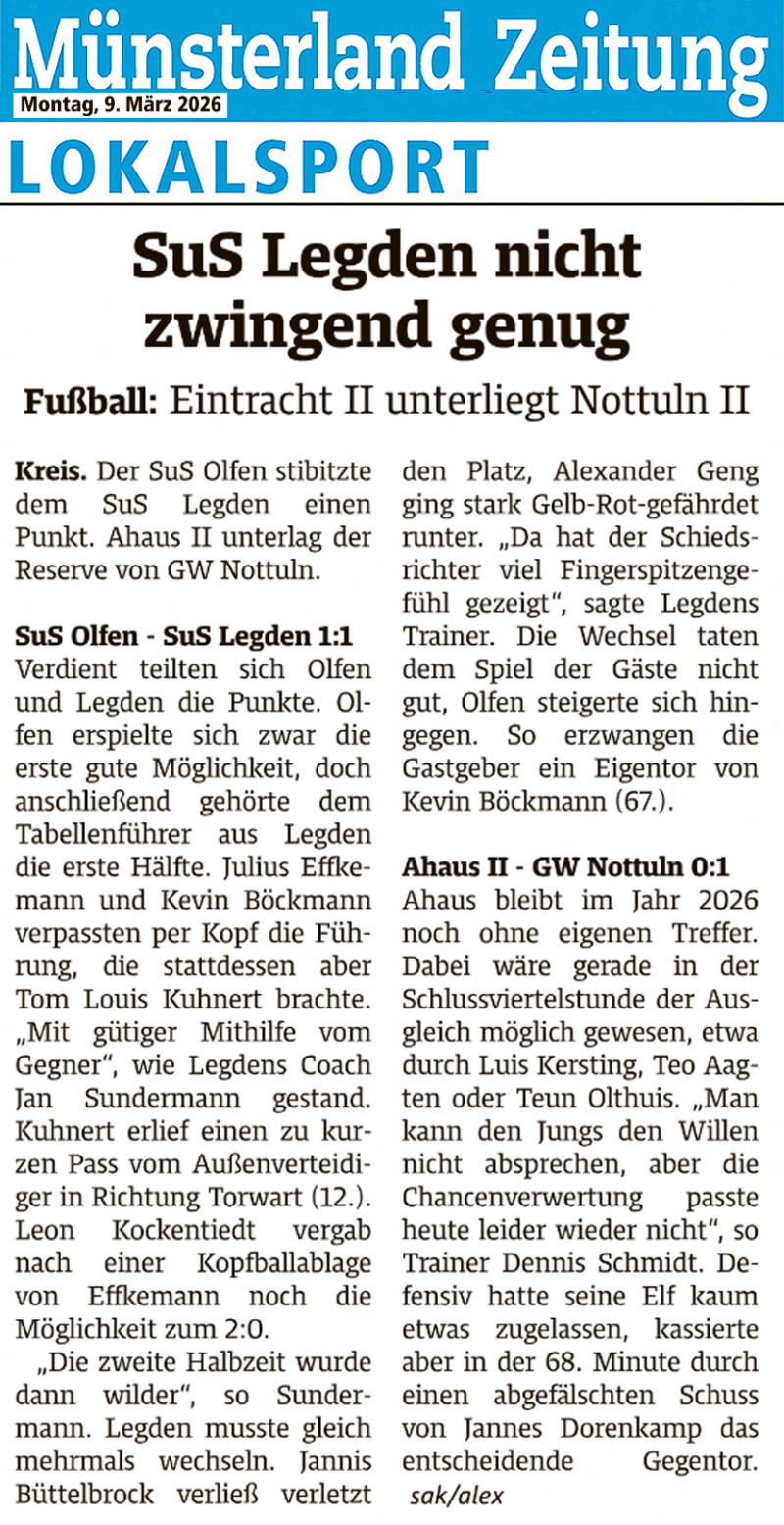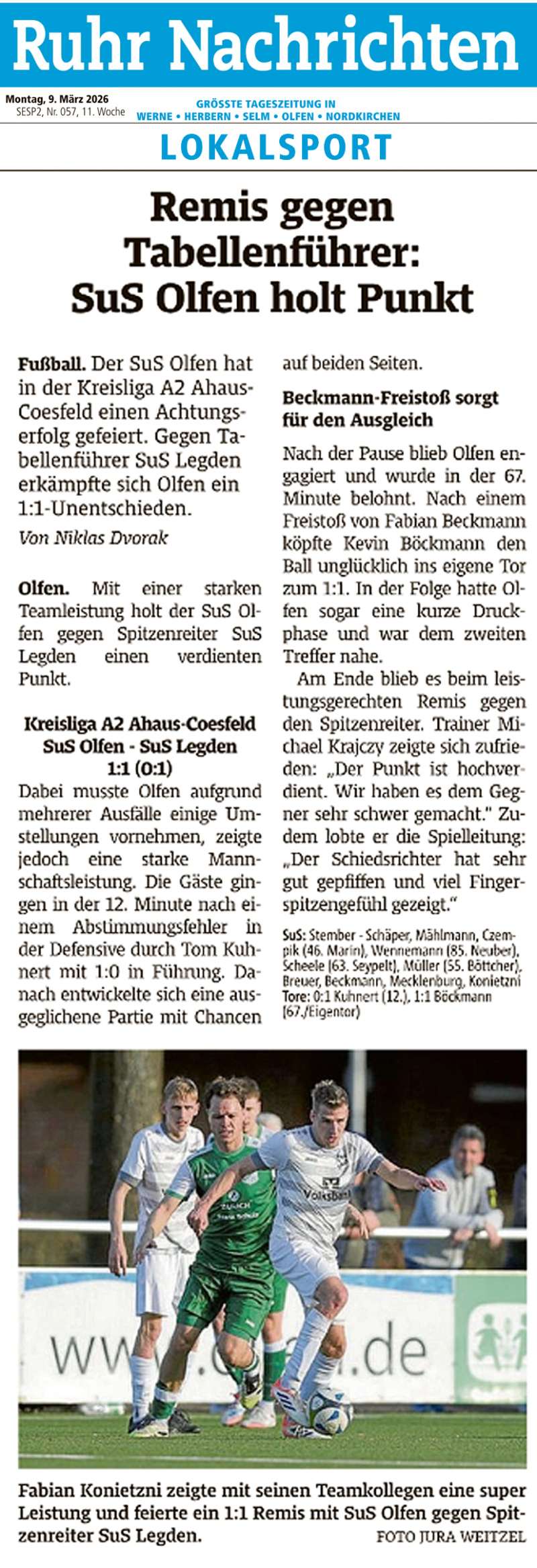 Die Kreisliga-Fußballer des SuS Legden bleiben in der Erfolgsspur: Mit dem 1:1 (1:1) beim SuS Olfen wuchs die Erfolgsserie der Sundermann-Schützlinge auf zwölf ungeschlagene Spiele.