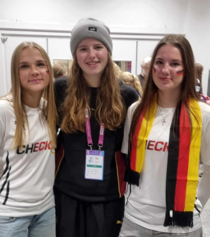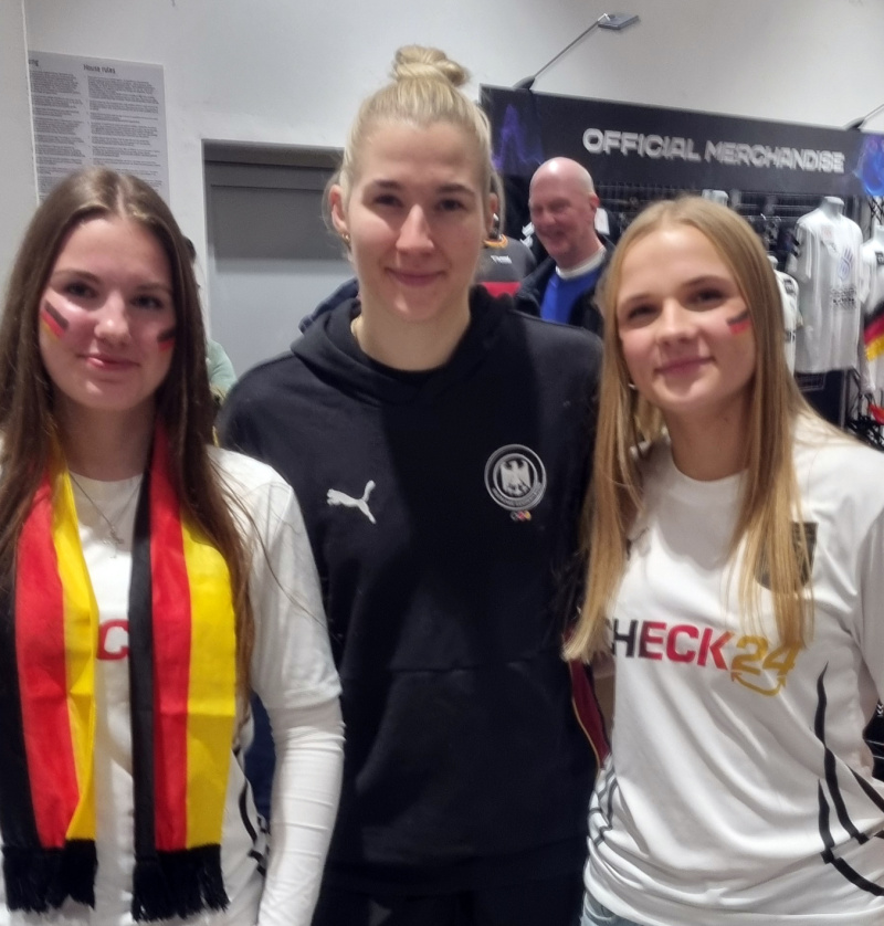 National-Torhüterin Katharina Filter (Mitte) mit zwei ihrer Fans vom SuS