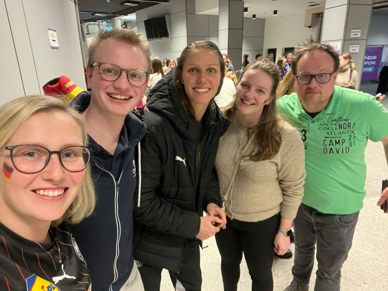 Rückraum-Nationalspielerin Xenia Smits (3. v. l.) mit ihren Anhängern vom SuS
