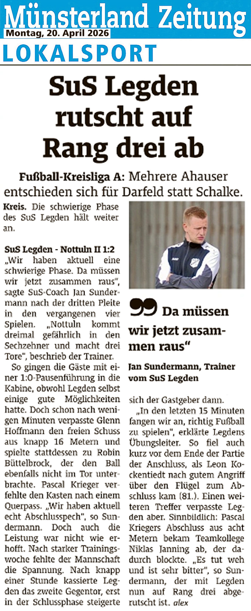 Elf Spiele in Folge war der SuS in seinem Stadion siegreich geblieben, ehe SG Coesfeld und nun GW Nottuln II diese Serie jäh beendeten. Damit endete (vorerst) auch der Gedanke an einen Aufstieg in die Bezirksliga - der ist nämlich nicht mehr aus eigener Kraft zu schaffen, denn Fortuna Seppenrade - am 10. Mai in Legden zu Gast - hat sich derweil ein Vier-Punkte-Polster zugelegt. und auch Borussia Darup hat zum SuS aufgeschlossen.