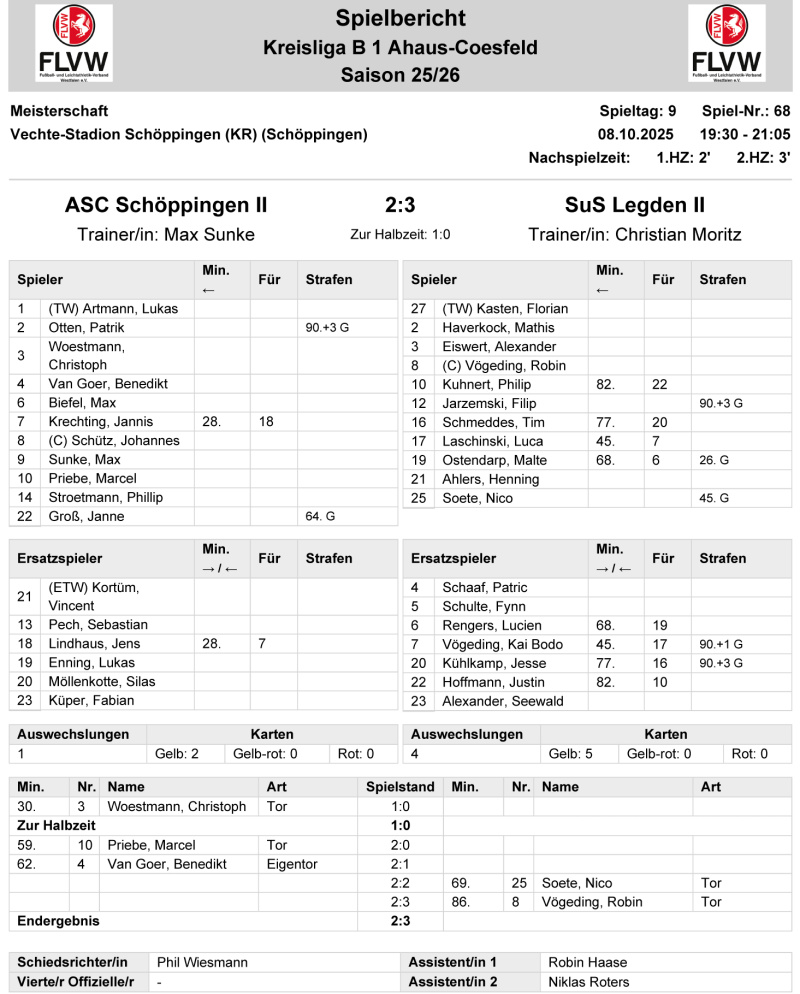 Im Schöppingenger Vechtestadion legte der Tabellen-Fünfte ASC II eine 2:0-Führung vor - unter den Torschützen auch der ehemalige SuS-Fußballer Marcel Priebe. Ein ASC-Eigentor und der erste Saisontreffer von Nico Soete innerhalb von nur acht Minuten brachten die Gäste aus Legden wieder heran - und Kapitän Robin Vögeding war es in der 86. Minute, der mit seinem zweiten Saisontor den 3:2-Sieg perfekt machte.