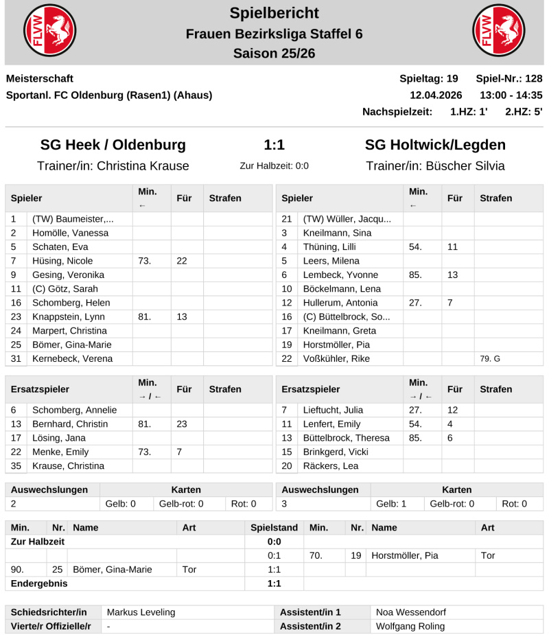 Im Derby zwischen den Bezirksliga-Fußballerinnen der SG Heek/Oldenburg und SG Holtwick/Legden gab es ein leistungsgerechtes 1:1-Remis. Die Fußballerinnen der SG Holtwick/Legden II kassierten in Schöppingen eine deutliche 0:4-Niederlage.