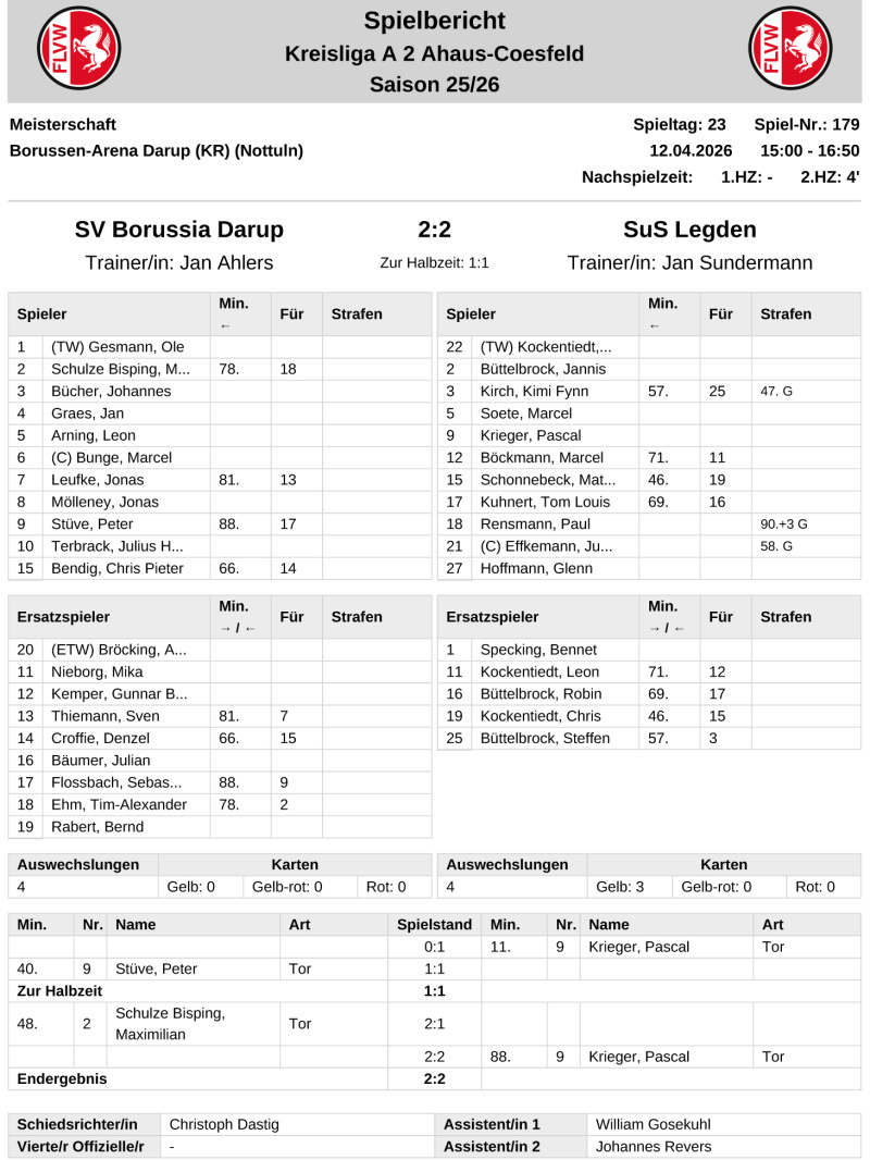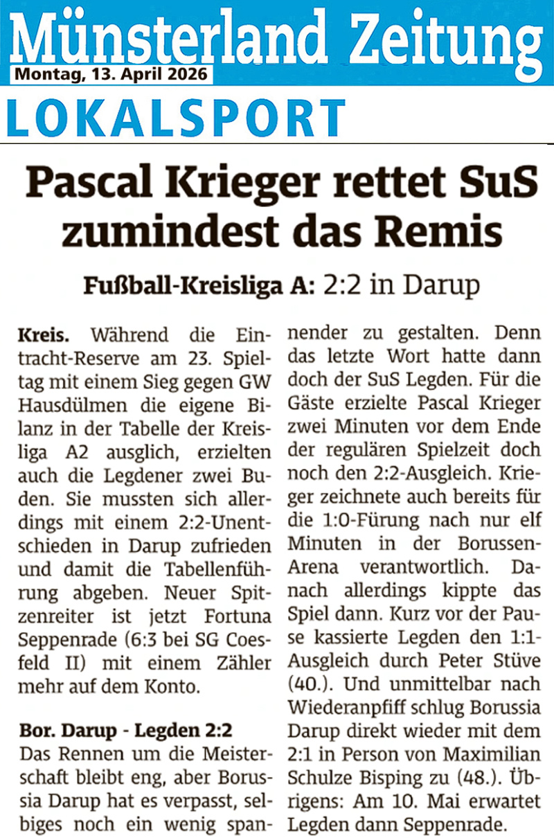 Die Kreisliga-Kicker des SuS Legden I haben nach dem 2:2 (1:1)-Unentschieden im Spitzenspiel der Kreisliga A2 bei Borussia Darup die Tabellenspitze für Fortuna Seppenrade freigeben müssen.