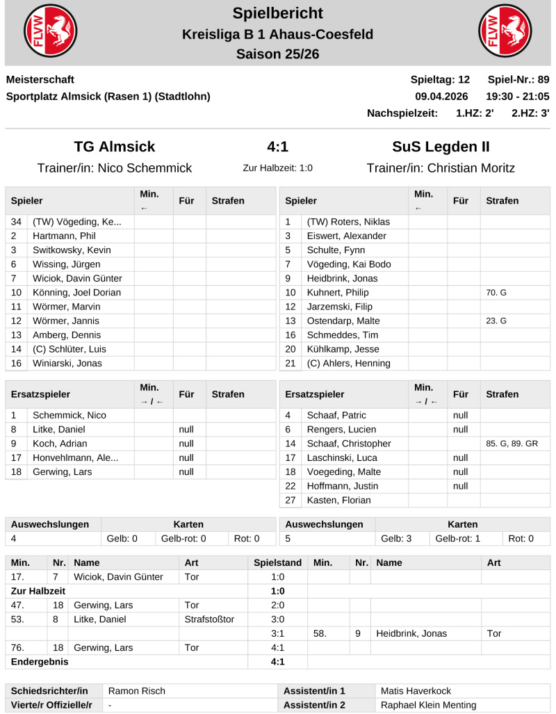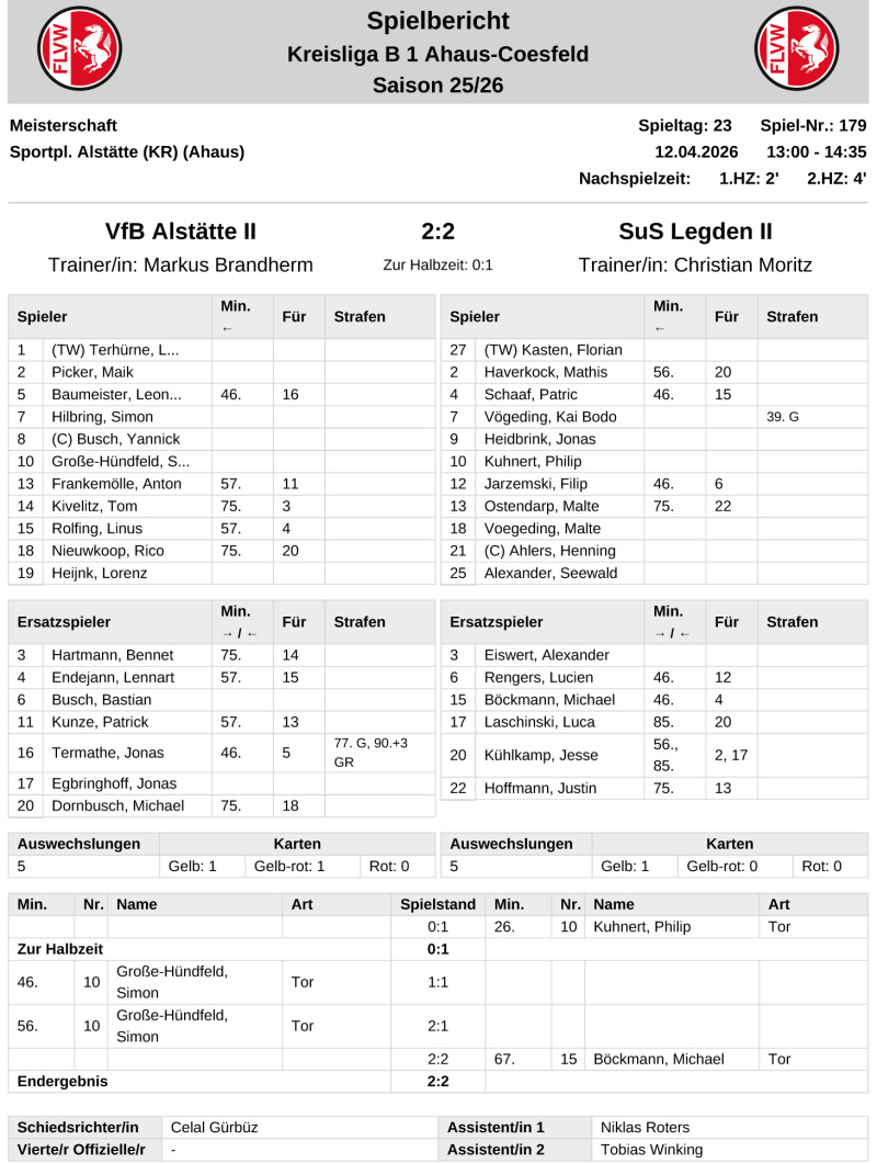 B-Ligist SuS Legden II fuhr nach der klaren 1:4-Niederlage im Nachholspiel bei TG Almsick ein 2:2-Remis in Alstätte ein und blieb damit als Tabellen-Neunter in den Top-10 der Liga.