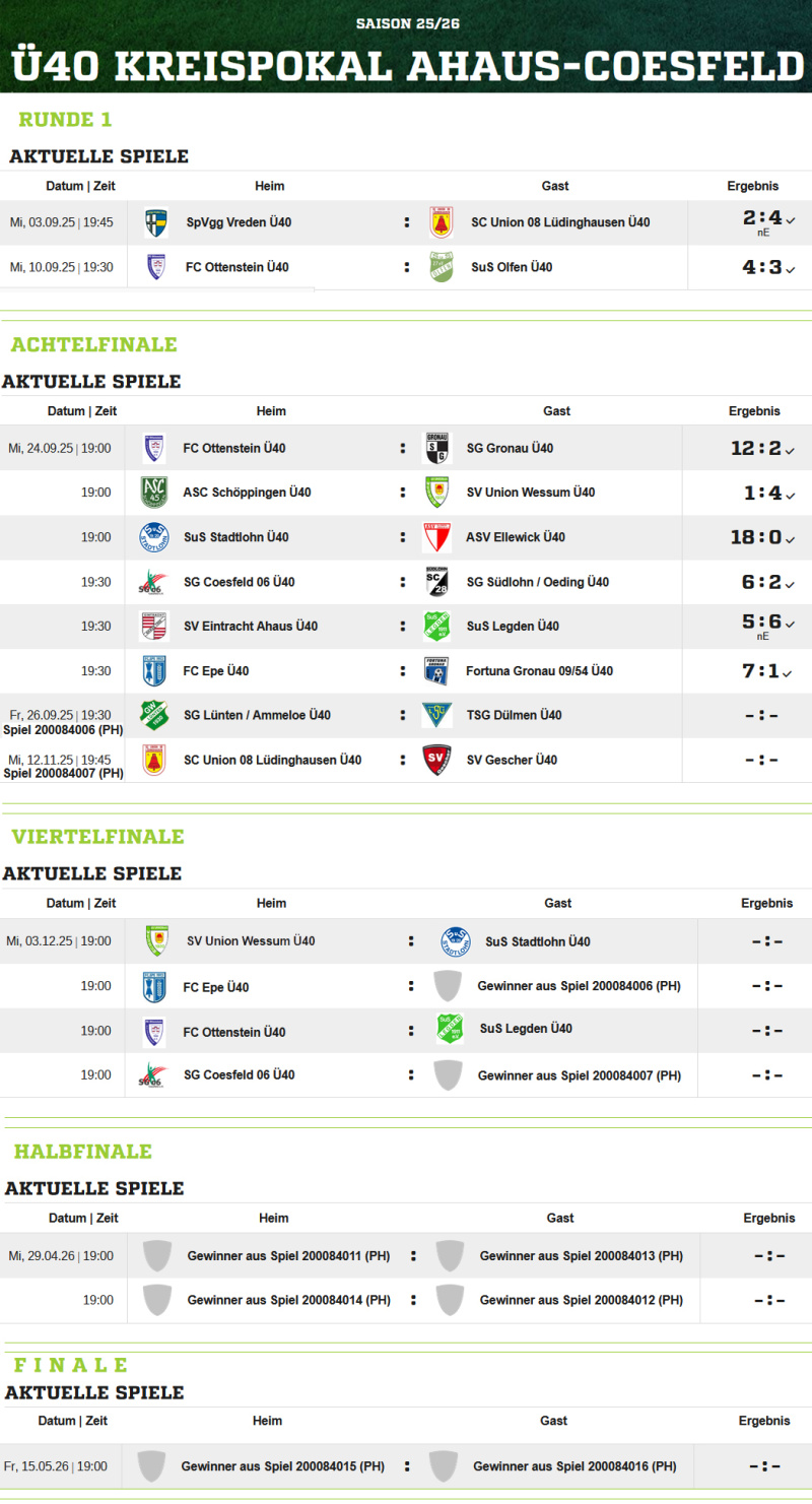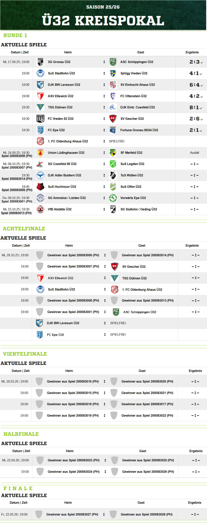 Die Übersicht der Spiele im Ü32-Kreispokalwettbewerb