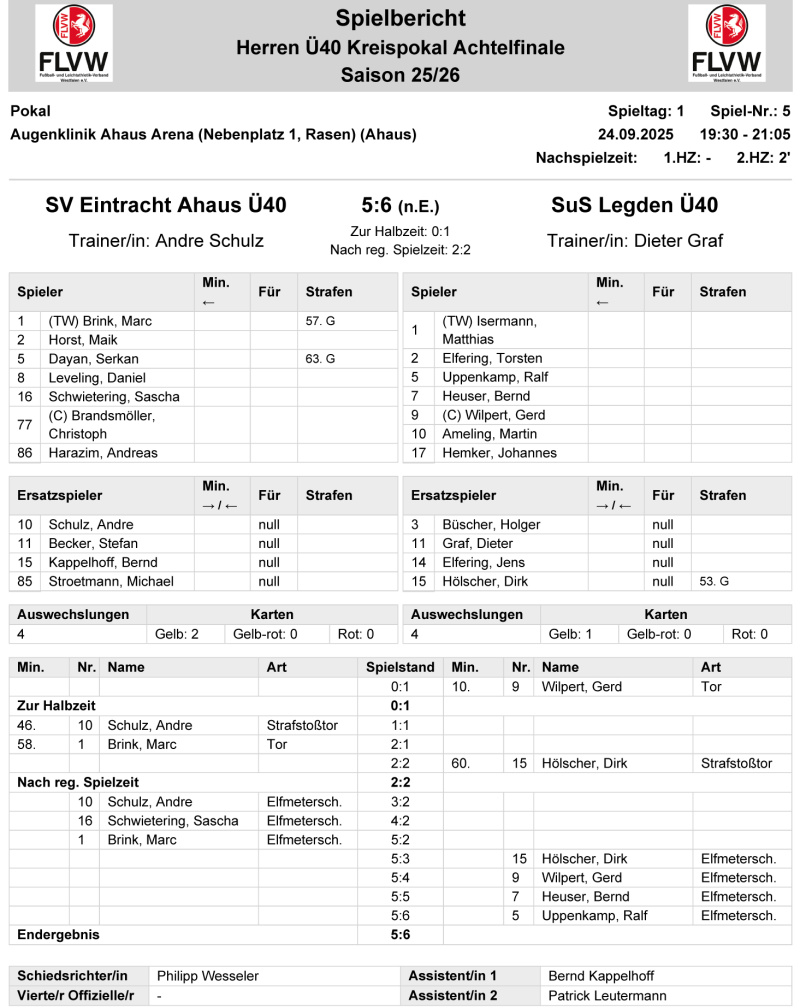 Die Altligafußballer des SuS Legden haben im Achtelfinale des Ü40-Kreispokalwettbewerbs einen 6:5-Sieg bei Eintracht Ahaus Ü40 nach einem Elfmeterschießen gelandet - und peilen am 3. Dezember beim FC Ottenstein das Halbfinal-Ticket an.