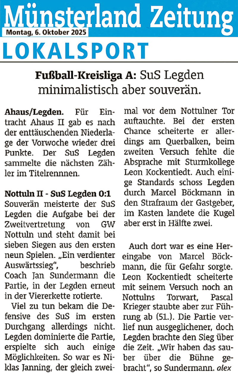Mit einem 1:0-Sieg bei GW Nottuln II haben die Kreisliga-Fußballer des SuS Legden ihre Ambitionen auf einen Platz im oberen Tabellendrittel unterstrichen. Der Abstand zum Ranglisten-Ersten SG Coesfeld beträgt weiterhin nur einen Punkt.