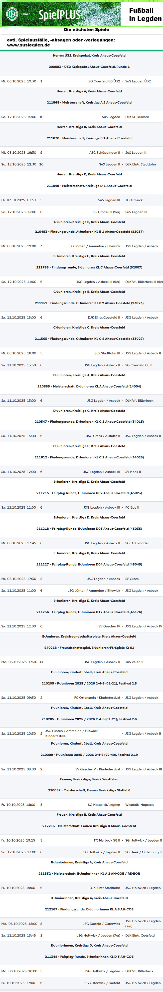 SuS Legden II hat seine B-Liga-Partie beim ASC Schöppingen II auf Mittwoch, 8. Oktober, 19.30 Uhr, verlegt. Und auch die D-Liga-Partie zwischen SuS Legden III und TG Almsick II wurde verlegt: Sie soll am Dienstag, 7. Oktober, um 19.30 Uhr in Legden angepfiffen werden.