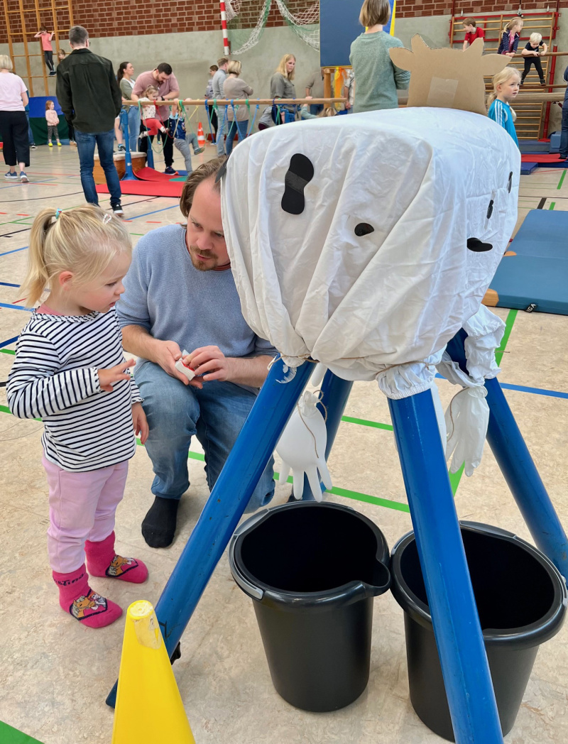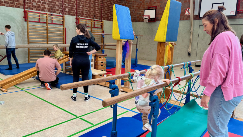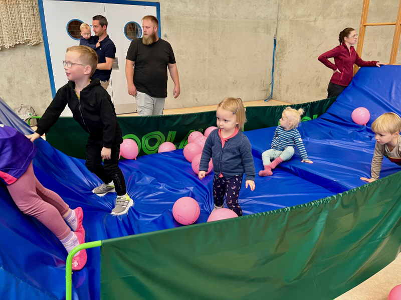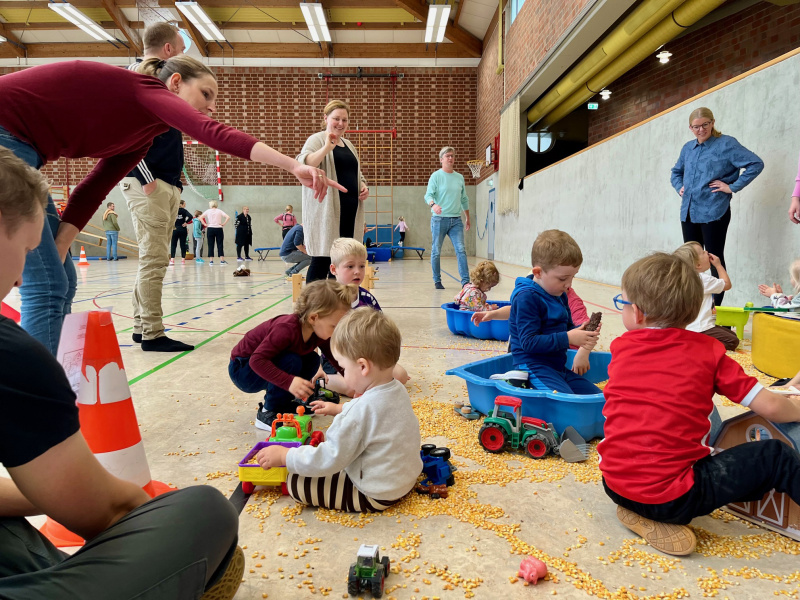 Nach einem gemeinschaftlichen Aufwärmen erfuhren schon die Kleinsten, dass es auf dem Bauernhof immer eine Menge zu tun und zu erleben gibt. So stand neben dem Kühe-Melken, Bullen-Reiten und einem Schubkarren-Rennen auch ein Reitparcours für Stecken- und Hüpfpferde zur Verfügung. In schwindelerregender Höhe pflückten die kleinen Sportler*innen Äpfel oder sprangen beherzt in einen großen Misthaufen. Ein eindrucksvoller Mähdrescher in der Mitte der Halle ließ die Herzen aller Maschinen-Fans höherschlagen und ein komplexer Hühnerstall forderte den Kindern einiges an Geschicklichkeit ab.
